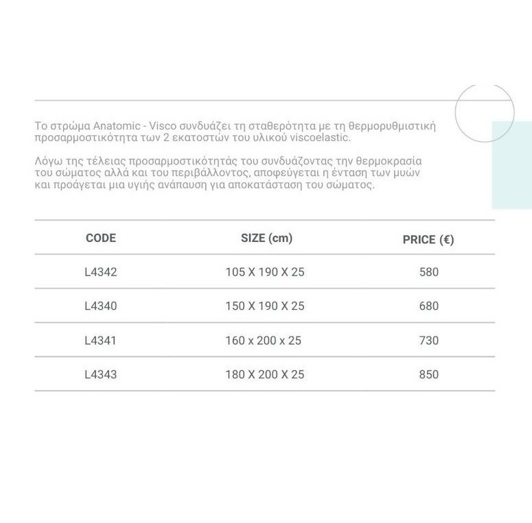 The Anatomic-Visco mattress combines the firmness of its core with the thermoregulatory adaptability of its 2cm of viscoelastic, sensitive to body and environmental temperature.